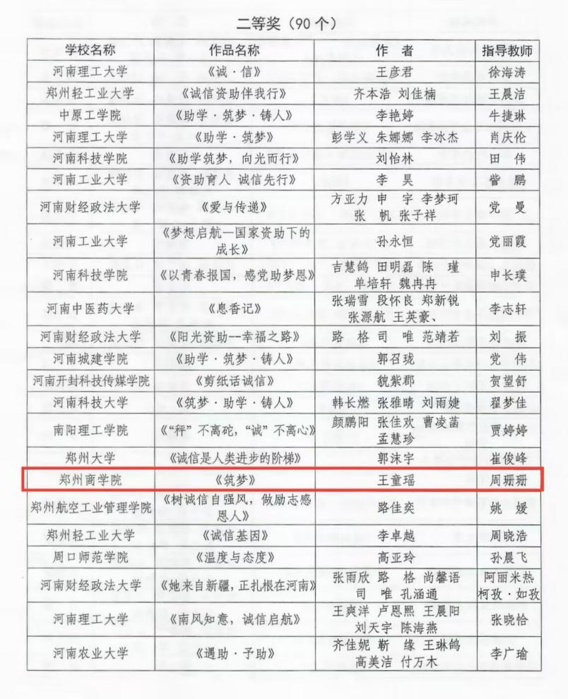 近日,河南省教育厅等五部门联合公布了2023—2024学年度河南省“诚信校园行”学生资助公益广告设计大赛结果,威尼斯官网《筑梦》(作者:王童瑶,指导老师:周珊珊)作品入围并斩获佳绩,荣获二等奖。