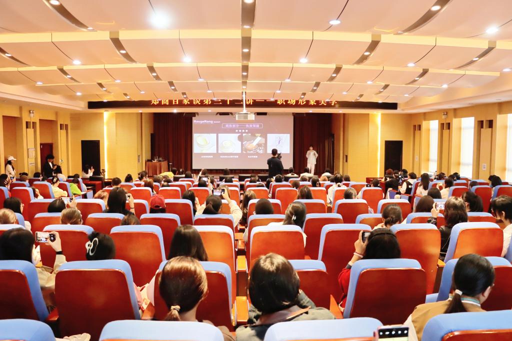 10月10日下午,郑商百家谈第32讲:职场形象美学——妆容礼仪,在图书馆五楼学术报告厅如期举行。此次讲座转学术交流为技术体验,邀请郑州胭脂绒文化传播有限公司高级化妆师冯帆莅校交流,指导师生探索职场妆容之道。全校300余名师生参与交流。