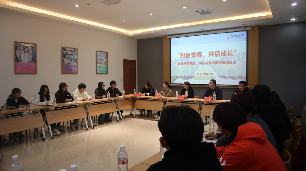 10月21日下午,管理学院组织开展“对话青春,共话成长”——院长、书记与学生面对面座谈会。管理学院院长李晓翠、党委书记宋森、教学秘书张瑜、团委书记陈勇彬及学生代表参加座谈会。座谈会中,学生代表结合实际,围绕专业课学习、考研考证考公、分层分类教学、创新创业、社会实践、等学习与个人发展方面提出自己的问题和建议。学院领导们认真倾听、详细记录学生发言,并就相关问题进行了及时回应与互动交流,党委书记宋森青年大学生发扬主人翁精神为学校事业建设与发展积极建言献策表示了充分肯定。他指出,同学们的成长与学校的发展紧密相连,学院高度关注学生的成长轨迹和成长氛围,学院将不断深化服务内涵,致力为大家营造一个舒适愉快的学习生活环境。同时,他也希望同学们能潜心学习、矢志成为栋梁之才,与学院共成长。