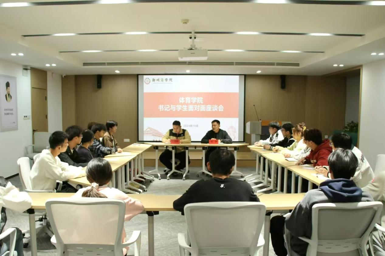 10月24日下午,体育学院于32号楼“一站式”学生服务社区组织开展“倾听学生心声,共话学生成长”——书记与学生面对面座谈会。体育学院党委书记刘健、行政秘书兼团委书记丁震霆及学生代表参加座谈会。会上,参会学生代表纷纷踊跃发言,聚焦教学管理、专业建设、校园活动、后勤保障等方面畅谈意见建议。刘书记认真倾听了每一位学生的发言,并就学生们关心的热点问题进行解答,同时承诺会将解决问题的方案进行公示。同时代表学院向同学们提出了五点期望:一是树立远大的理想,二是追求大格局,三是锤炼意志品质,四是培养全面发展的能力,五是锻炼“野蛮”的体魄。青年学生作为国家的未来和希望,要努力承担起国家兴旺和民族振兴的重担,爱国荣校,做政治过硬、专业能力过硬的时代新人。