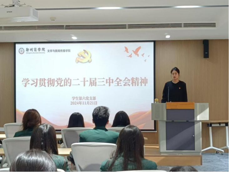 为深入学习贯彻习近平总书记在省部级主要领导干部学习贯彻党的二十届三中全会精神专题研讨班开班式上的重要讲话精神,引导学生党员切实把思想和行动统一到习近平总书记重要讲话精神和党中央决策部署上来,11月21日,文传学院学生第六党支部于32号楼“一站式”学生社区团体活动室召开党的二十届三中全会精神理论学习会,本次会议由学生第六党支部书记温舒涵老师主持。