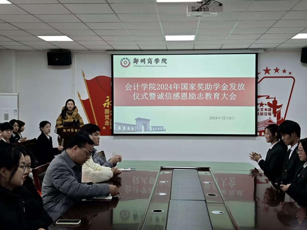 为贯彻落实国家资助政策,确保奖助学金发放到位,鼓励优秀学子不断成长,学会感恩,12月6日,会计学院在广恩楼103会议室举行2024年国家奖助学金发放仪式暨诚信感恩励志教育大会。通过此次国家奖助学金发放仪式暨诚信感恩励志教育大会,同学们感受到了国家和学校的关怀与帮助,接下来他们将继续努力,苦练技能,争做优秀的郑商学子。