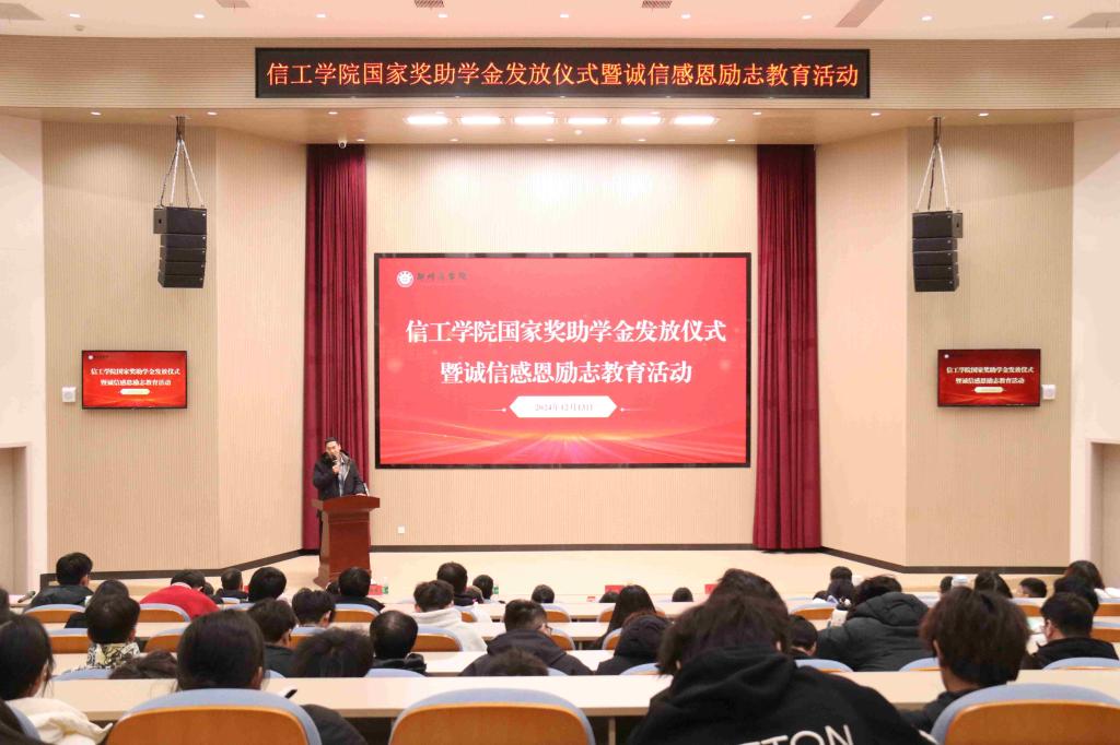 为深入贯彻落实国家及我省各项学生资助政策,信工学院建立起以奖助学金、生源地助学贷款为主,以绿色通道、勤工助学为辅的多元资助体系,切实保障家庭经济困难学生顺利入学并完成学业。12月13日,在信工学院报告厅开展国家奖助学金的发放仪式,并借此机会,深入开展诚信感恩励志教育活动。