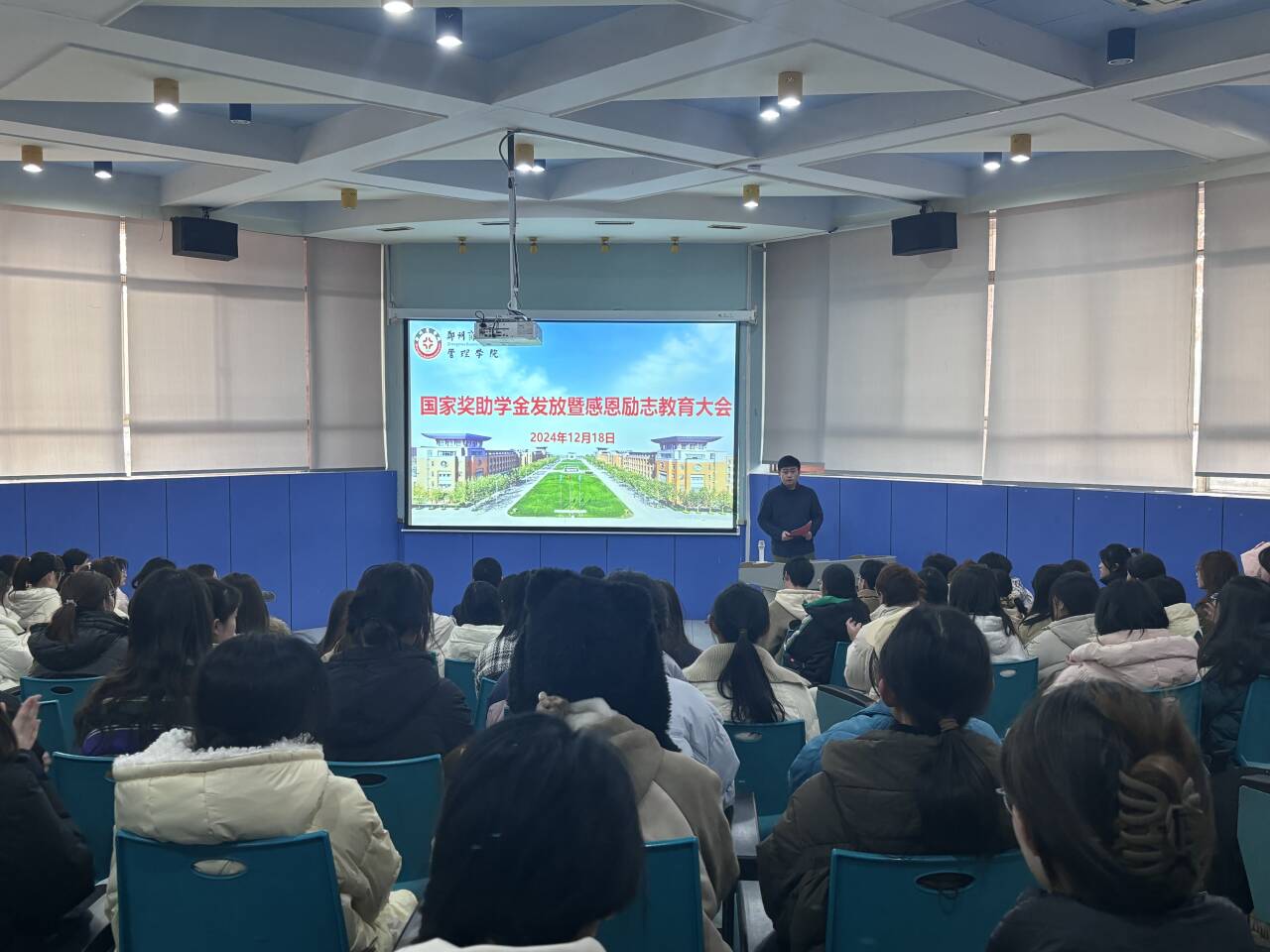 为更好贯彻落实2024年国家奖助学金发放工作,不断扩大资助政策宣传,管理学院于12月18日在2号教学楼116阶梯教室开展2024年国家奖助学金发放暨感恩励志教育大会。通过此次会议的召开,进一步加深同学们对资助政策的了解,珍惜这份来自国家、学校的爱意、督促受助学生合理规划使用受助资金,并激励广大青年学生努力学习、奋发向上。