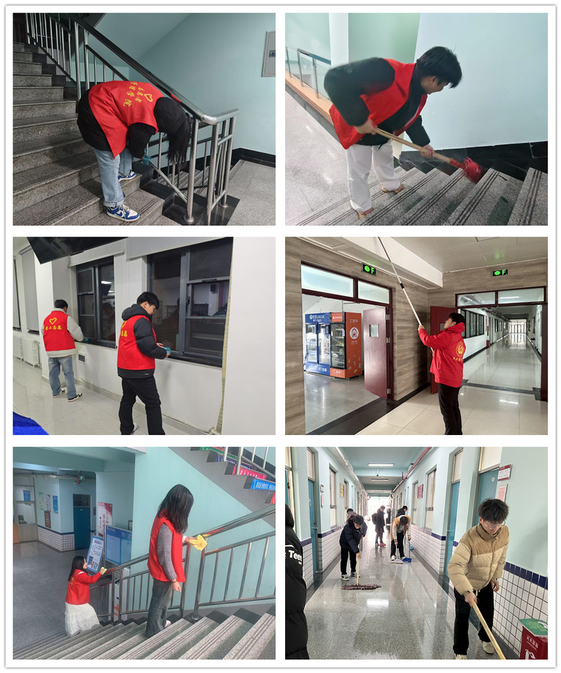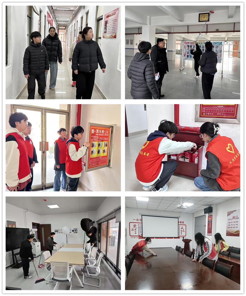 3月4日-3月7日,各学院组织开展教学楼卫生大扫除,对楼管员值班室、辅导员办公室、学院会议室、资料室、学生使用教室进行全面打扫,同时排查安全隐患,确保各类消防设施齐全有效、消防设备更新及时、疏散通道畅通无阻,严禁堆放杂物、私拉乱扯电线的现象,发现问题及时整改。