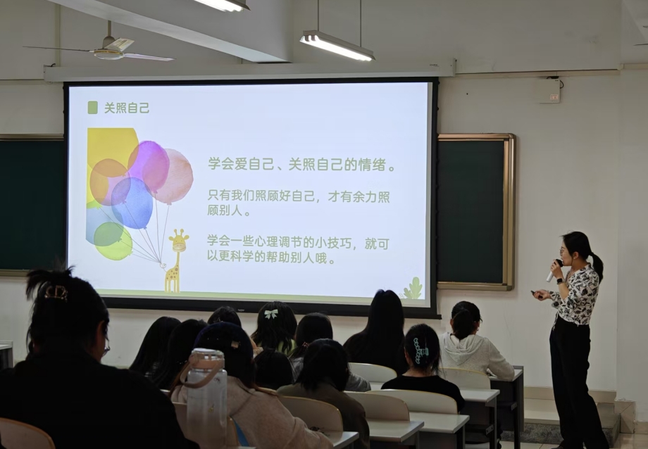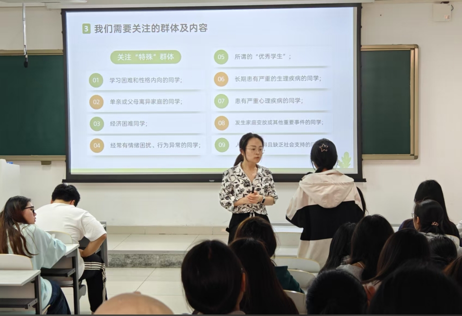 为进一步优化心理健康教育四级网络工作机制,提升2024级心理委员的工作能力,心理健康教育中心于3月26日下午在广恩楼开展“大学生常见心理问题识别及应对”第八期培训活动,围绕心理委员工作职责、需要关注的群体及内容、异常问题如何应对等方面开展。本次培训由心理健康教育中心梁培培老师主讲。