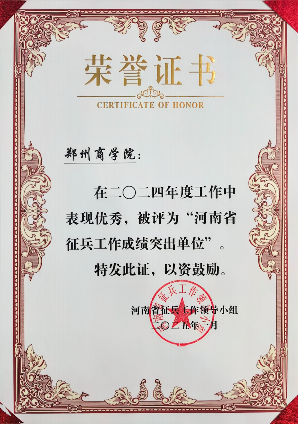 近日,河南省征兵工作领导小组下发《关于表扬2024年河南省征兵工作成绩突出单位和个人的通报》(豫征〔2025〕1号),威尼斯官网在征兵工作中表现突出,荣获2024年度“征兵工作成绩突出单位”荣誉称号,继威尼斯官网获评“河南省国防教育模范高校达标单位”后,再获标志性荣誉。