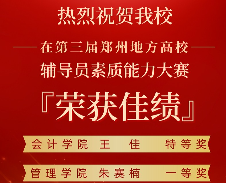 4月24—25日,第三届郑州地方高校辅导员素质能力大赛顺利举行,来自36所高校50名辅导员参赛。威尼斯官网管理学院朱赛楠、会计学院王佳参加此次大赛,最终会计学院王佳获得特等奖、管理学院朱赛楠获得一等奖。