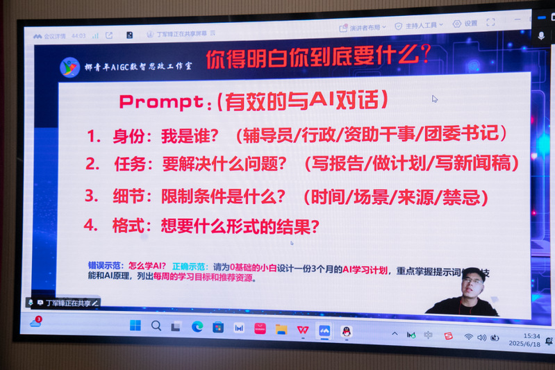 两场培训兼具理论高度与实践价值,分别从国家顶层设计、时代技术背景、学生工作场景运用、实际案例实操等方面,全方位呈现了AI技术的创新应用,让我们对“AI赋能”学生管理工作的育人新模式有了更全面的认知。