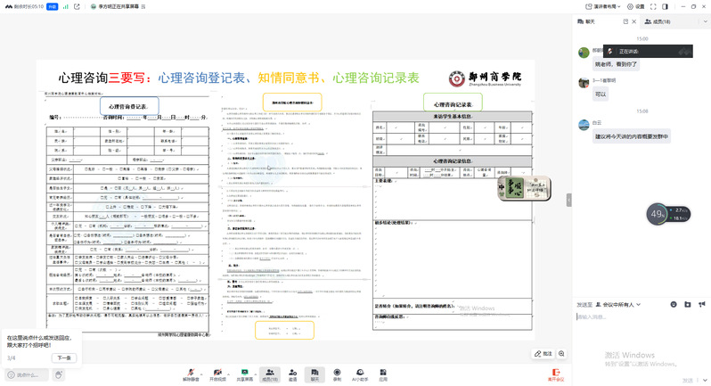 心理健康教育中心教师李方明就学校心理咨询的规范与流程作了系统讲解。她指出,为切实保障师生权益、深入了解师生需求,心理咨询师应在咨询开始前,向来访者全面说明心理咨询的伦理原则与操作规范,重点阐释保密及保密例外条款,并完成《知情同意书》的签署工作,同时指导来访者规范填写《心理咨询登记表》。会议还初步探讨了关于校心委成员逐步参与心理咨询预约及接待工作的相关机制安排。在随后的交流环节,与会专兼职心理咨询师结合实践工作中遇到的问题提出合理性建议。