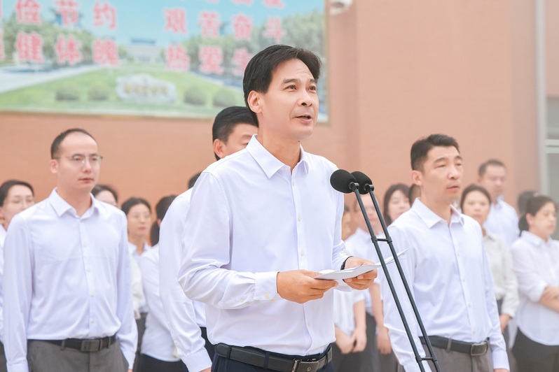 党委书记吴建军以《在郑商书写青春的“华彩篇章”》为题,为现场师生讲授“开学第一课”。他首先代表学校向2025级新同学表示热烈欢迎,向返校师生致以亲切问候。吴书记指出,郑商正处于内涵发展的关键阶段,新生的到来,为郑商加快迈向特色化、高质量发展之路注入了澎湃的新动能;而郑商,亦将成为学子们逐梦星辰大海的启航之地。今年是中国人民抗日战争暨世界反法西斯战争胜利80周年,全体师生要传承和弘扬伟大抗战精神,踔厉奋发、勇毅前行,为以中国式现代化全面推进强国建设、民族复兴伟业而团结奋斗。吴书记寄语青年学子:一是厚植爱国情怀,砥砺强国之志。要努力在科技创新、文化传承、社会服务中找准人生坐标,在民族复兴赛道上争当先锋,成为具有深厚爱国情怀与远大理想抱负的新时代青年。二是磨砺坚韧意志,勇担时代使命。要从坚守中汲取丰富养分,以“滴水穿石”的韧劲磨砺自我,以“挺身而出”的担当拥抱时代,在成长路上稳步前行,成为堪当民族复兴重任的新时代青年。三是锤炼过硬本领,凝聚奋斗力量。要珍惜时光,求真学问、练真本领,把报国之志转化为实际行动,奋力在新时代新征程中建功立业。
