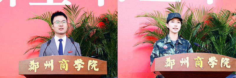机电工程学院曹飞扬作为教师代表发言,勉励新生以军训中淬炼的意志为帆,以郑商的滋养为桨,在大学四年里,坚守初心,勇担使命,书写属于自己的青春华章。艺术学院王云淇代表新生立下青春誓言,将以“奋斗”为笔,做勇闯未知的探索者;以“温情”为桥,做拥抱多元的同行者;以“实践”为帆,做心怀家国的践行者。