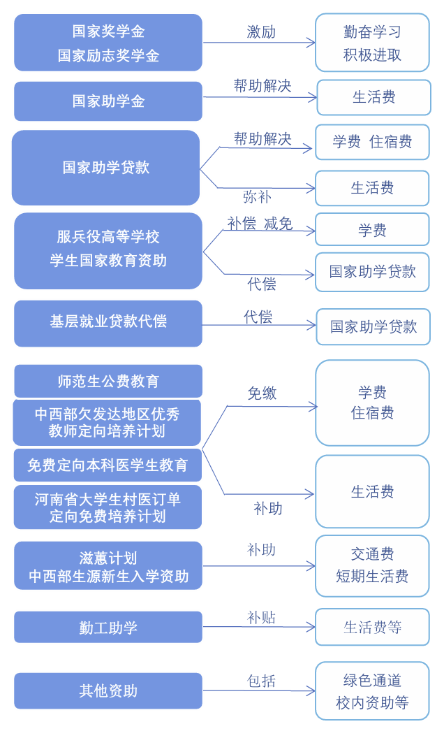 国家和河南省在高等教育本专科阶段建立起国家奖学金、国家励志奖学金、国家助学金、国家助学贷款等多种形式有机结合的高校学生资助政策体系。