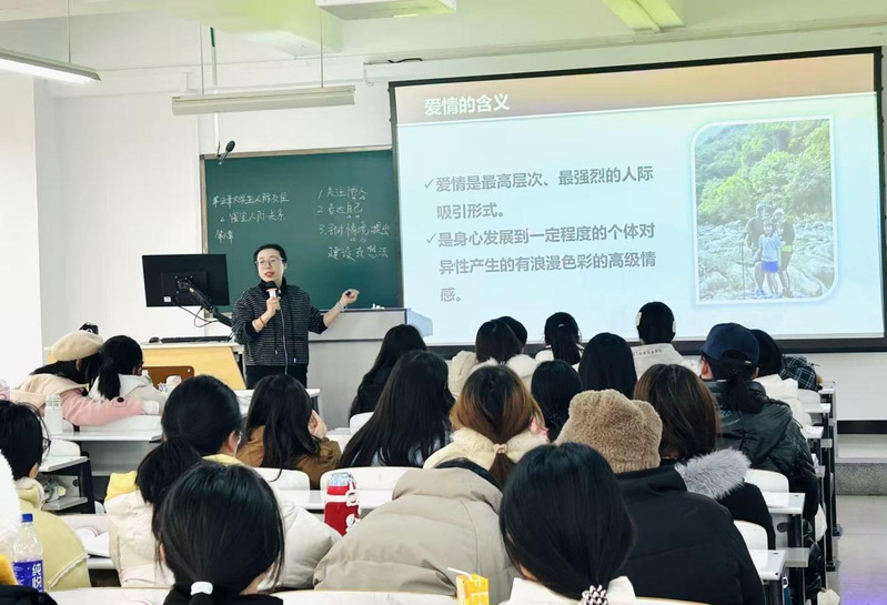 公开课伊始,卫丹老师首先通过OH卡投射造句活动,用一张张色彩斑斓的卡片启发学生思考“爱是什么/爱不是什么”,引起了学生对恋爱话题的兴趣。课程中,卫老师以深入浅出的方式,结合自身丰富的教学经验,系统讲解了爱情的三要素(亲密、激情、承诺)和四个发展阶段(共存、反依赖、独立、共生),并通过分享自己的爱情故事,将抽象的理论知识转化为生动的现实案例,帮助学生更好地理解爱情的本质和成长过程。卫老师强调,大学生在恋爱中需注重心理调适,学会平衡情感需求与个人发展,以积极健康的心态面对恋爱中的挑战。