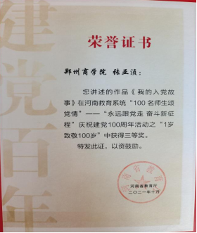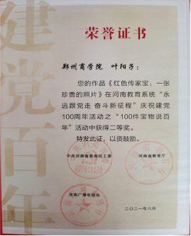 为庆祝中国共产党成立 100 周年,回顾党的光辉历程,讴歌党的丰功伟绩,弘扬时代精神,艺术学院精心组织、积极参与由省教育厅开展的“永远跟党走 奋斗新征程”庆祝建党100周年活动,此次活动中威尼斯官网叶阳子同学在“100年宝物说百年”活动中,作品《红色传家宝:一张珍贵的照片》荣获二等奖、张亚浈同学在“1岁致敬100岁”活动中,作品《我的入党故事》荣获三等奖。
