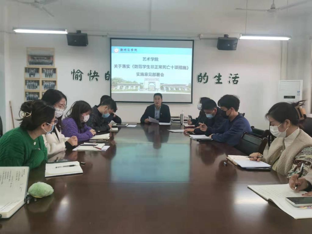 为深入贯彻上级决策部署,进一步做好防范学生非正常死亡工作,保障学生生命安全,筑牢生命安全底线。艺术学院于3月30日上午在艺术楼二楼会议室召开关于落实《防范学生非正常死亡十项措施》实施意见部署会,党委书记周余、团委书记刘健及全体辅导员参加此次会议。