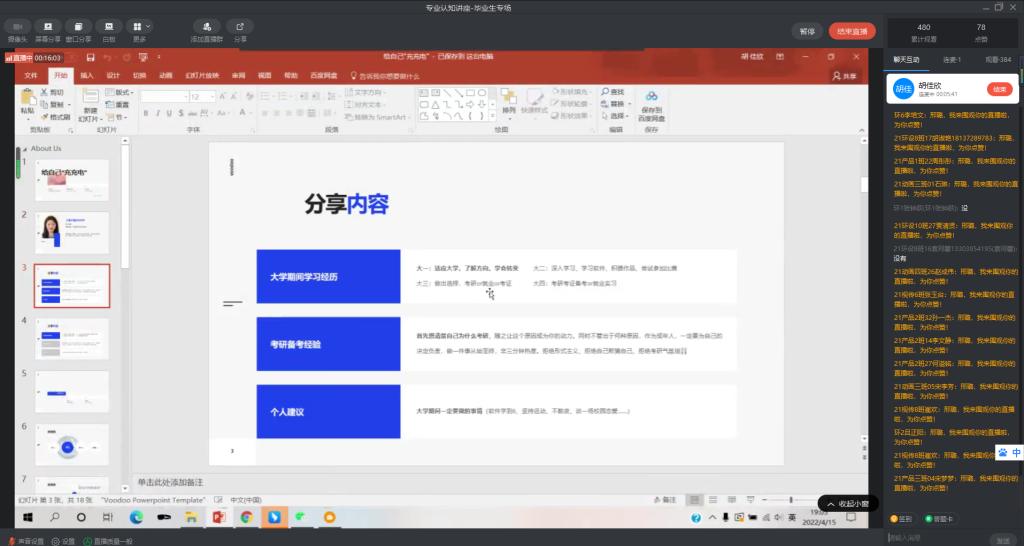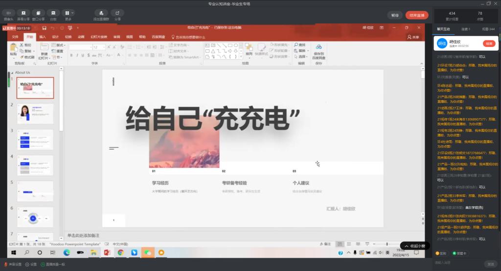 4月15日晚,威尼斯官网优秀毕业生胡佳欣通过钉钉直播作《给自己“充充电”》为主题的报告。
