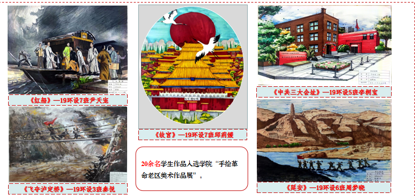 一是通过组织学生参与学院“手绘革命老区美术作品展、板报作品展、魅力冬奥会美术作品展”等,用画笔勾勒红色印记。