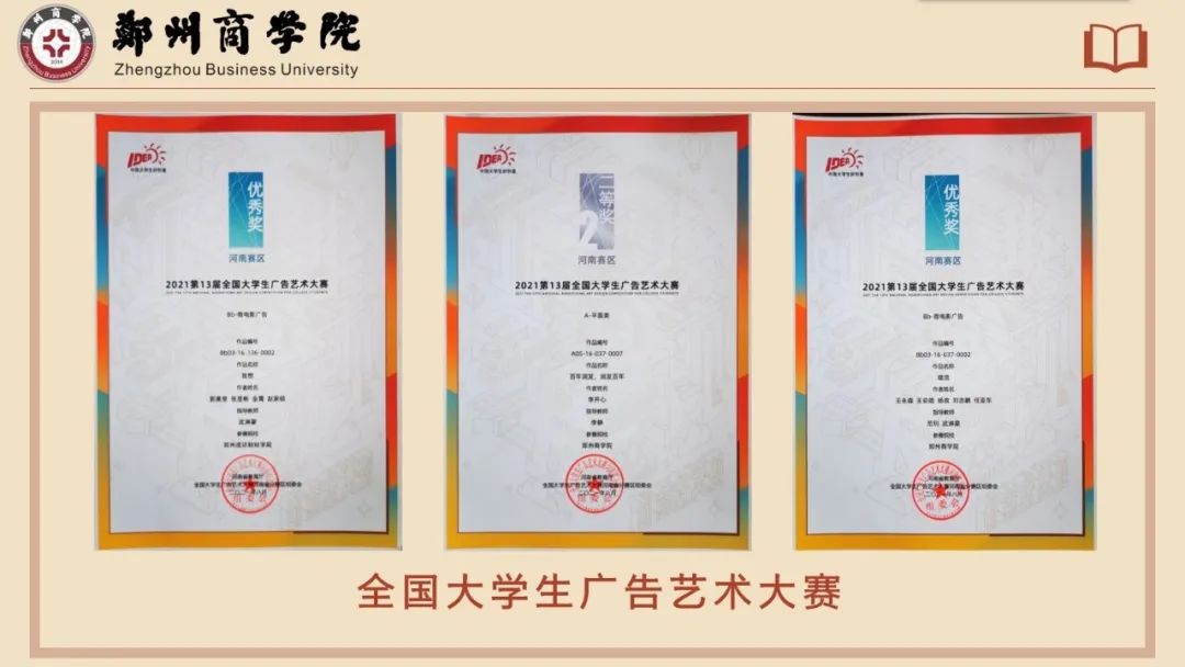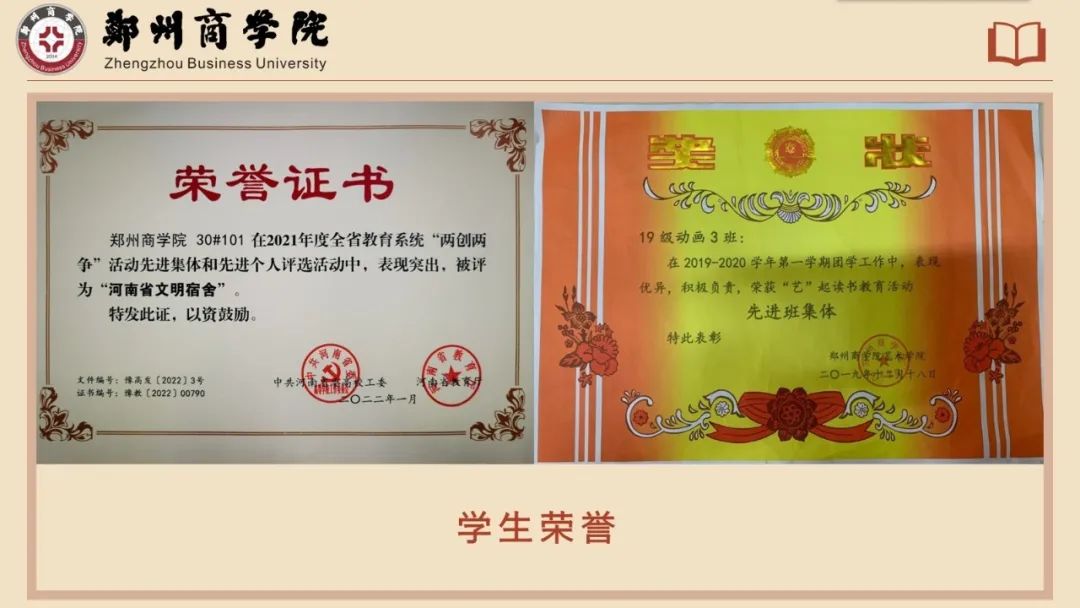 经过悉心指导和同学们的共同努力,多名学生获得“朗读者先进个人”、“优秀读书笔记最佳个人”等荣誉称号,30号楼101宿舍获得“河南省文明宿舍”,所带19动画3班获得“读书教育活动先进班集体”,多人参加“全国大学生广告艺术大赛”,并取得优异成绩。