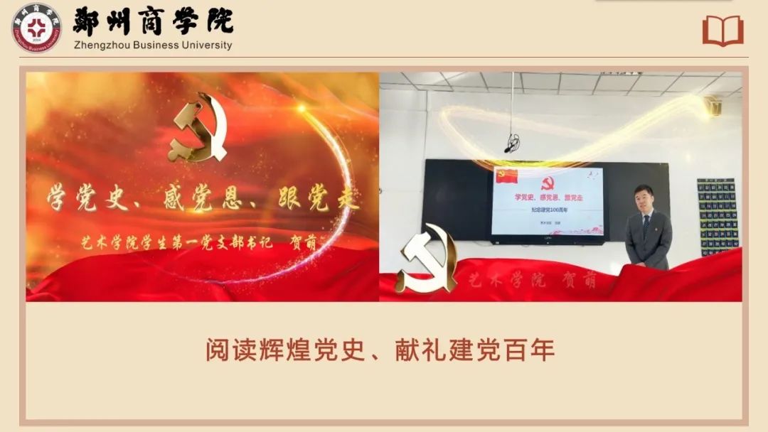 辅导员作为学生成长的引路人,与学生在一起要起到榜样作用,不爱阅读的辅导员也很难给学生带来阅读方面好的影响。2021年恰逢中国共产党成立100周年,该同仁代表艺术学院参加了学校微党课大赛,通过阅读辉煌党史,为建党百年献礼。