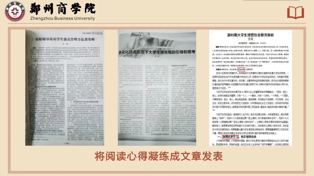 同时让阅读成为自己辅导员职业素养提升的有效帮手,不断汲取书籍的营养,助力学生日常管理,助力自己职业成长,将阅读心得凝练成文章进行发表,不断丰富提升自己的学生管理水平,通过日积月累朝着辅导员专业化的方向努力奋进。