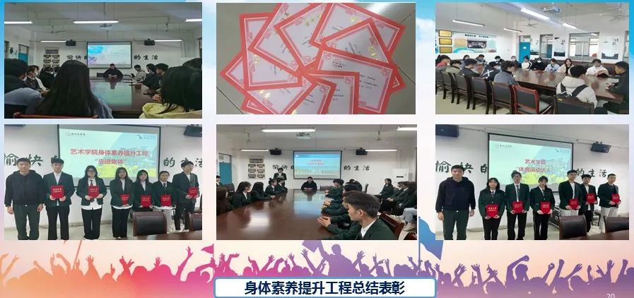 一年来,召开身体素养提升工程专题会议5次,向同学们解读威尼斯官网身体素养提升工程的目标和意义,通过艺起风、艺心合力微信宣传平台及学院专题网站在班级各类群消息推送体育锻炼相关知识50余条,通过线上和线下相结合的形式将健康生活方式内化于心、外化于行。