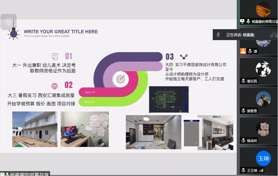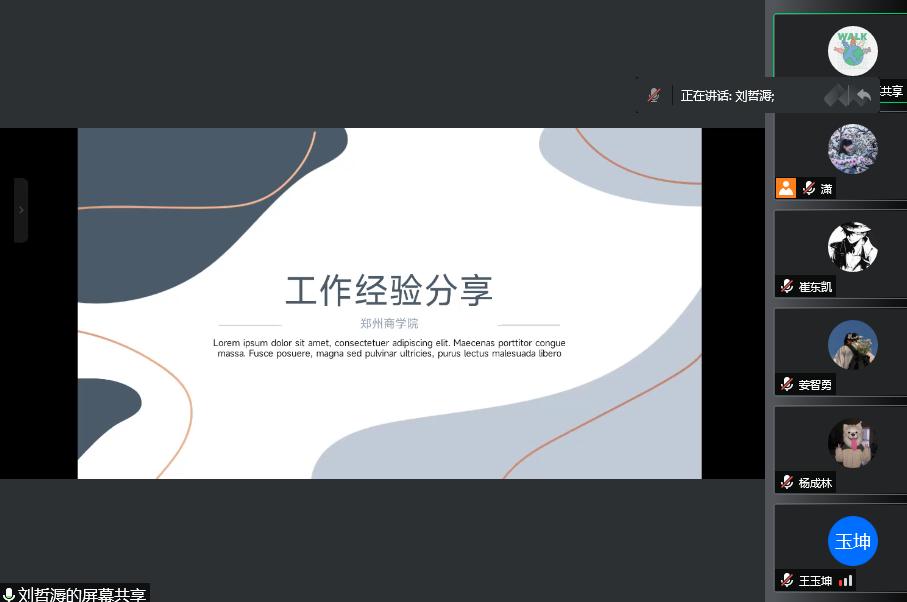 活动中,分别任职于河南鼎冠装饰有限公司和鹤壁市晨一美术的杨露露、刘哲溽两位同学重点讲解了如何在大学期间加强对自己的认知探索,逐步确立自己的职业目标,在获取相关行业和领域基本信息的基础上加强自己相应能力储备的重要性;来自于郑州市都驰全屋定制的时丕顺同学则为大家分享了他个人在企业实习的经历,建议大家在工作岗位上要勇于面对困难,不仅要细心观察还要放开手脚,做有准备的人才能迅速的独当一面。在漯河市郾城区裴城镇人民政府实习的杨成林同学则提醒大家在工作岗位中要注意学习一套相对正规的职场礼仪和做事逻辑,如此才能为自己后续快速融入职场生活、减少碰壁的可能。最后任职于河南炉火影业有限公司的伊晨光同学围绕“全能不代表有竞争力、详细不等于全面“这个话题”为同学们分享了他在工作中的经验体会。