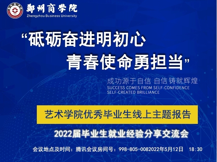5月12日下午,艺术学院组织的以“砥砺奋进明初心 青春使命勇担当”为主题的2022届毕业生就业经验分享会交流会通过腾讯会议的形式顺利开展。本次活动邀请了来自18环设、动画两个专业的5位同学进行分享。学院300余名大三学生参加了本活动。活动由18级辅导员陈雨潇主持。