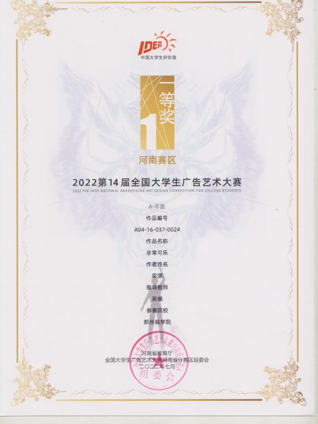 本次大赛启动以来,学院领导高度重视,积极宣传、精心组织、认真筹备。同学们刻苦钻研,不断打磨作品,指导教师们充分发挥科研创新精神,认真指导备赛,提交参赛作品近200件。获得河南省奖项共36项,一等奖1项,二等奖6项,三等奖13项,优秀奖11项,优秀指导教师5名,其中张淇同学的包装设计作品《果汁乐》荣获国家级优秀奖。