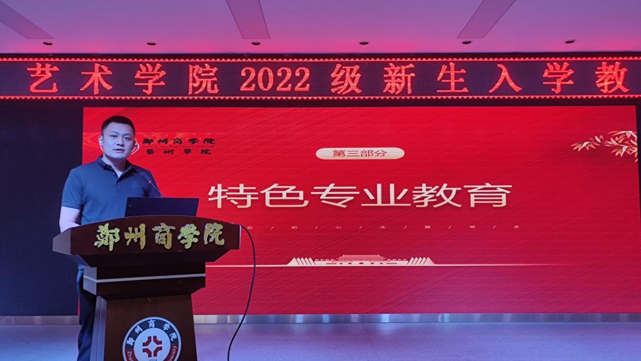由艺术学院副院长徐千淇致辞。徐院长首先对新同学的到来表示热烈欢迎与深切问候,对家长的辛勤付出表达诚挚祝福。徐院长在会上讲到艺术学院经过十五年的发展,逐渐凝练和打造出“艺术+商科”的学科发展定位,不断摸索出“把作品转化为商品,让课堂贴近于市场”的人才培养模式。从学科建设方面、硬件设施建设方面向同学们详细地介绍了教师队伍及专业建设。拥有河南省在功能性、先进性和规模性较为领先的商业艺术实验中心,“以学生为中心”的分类教学培养方案。鼓励同学们在学习期间根据自己的情况分类发展、精准化学习。