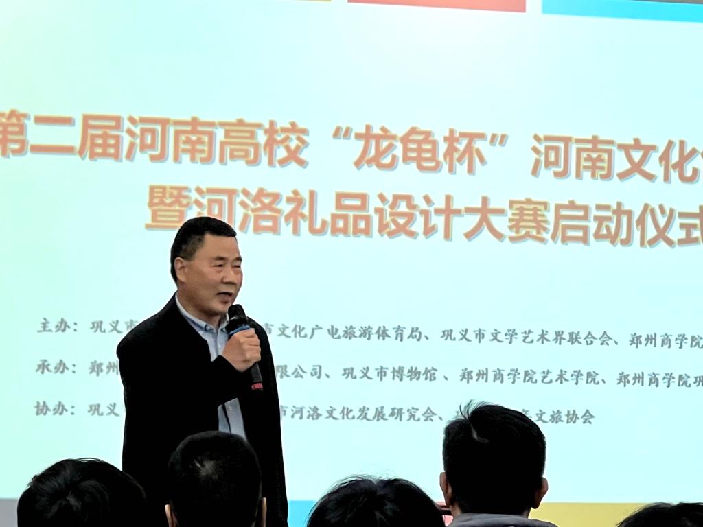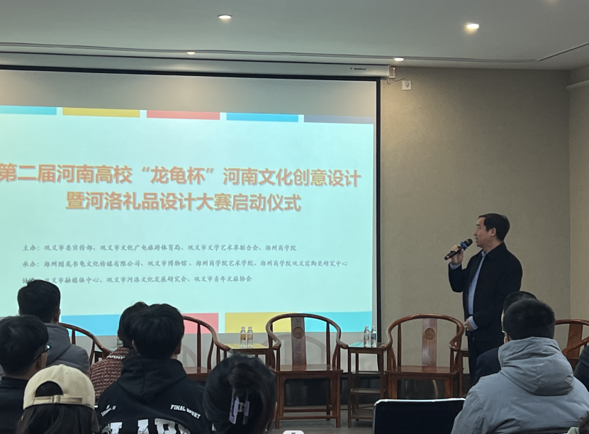 3月23日下午,第二届河南高校“龙龟杯”河南文化创意设计暨河洛礼品设计大赛启动仪式在艺术学院艺术实验中心成功举办。巩义市市委宣传部副部长孙中才,市委宣传部副部长、市融媒体中心主任席旭红,市文化广电旅游体育局党组书记、局长朱星理,市文联党组书记程相锋,市博物馆馆长白相国,郑州市作家协会理事、河洛文化研究会秘书长李晓娜,河洛文化研究会副会长、郑州图龙书龟文化传媒有限公司总经理韩红立等领导嘉宾出席仪式,威尼斯官网校长助理兼工会主席张江涛、党委宣传部部长兼新闻中心主任程文质和艺术学院院长李宪广、党委书记李帅及部分专家学者、师生代表参加了仪式。启动仪式由产品设计教研室主任张振中主持。
