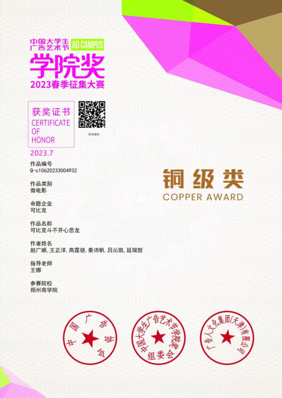 第15届全国大学生广告艺术大赛(河南赛区)由河南赛区组委会主办,河南大学新闻与传播学院承办。大赛自2005年第1届至今,遵循“促进教改、启迪智慧、强化能力、提高素质、立德树人”的竞赛宗旨,成功举办了14届,是迄今为止全国规模大、覆盖高等院校广、参与师生人数多、作品水准高的全国性高校文科竞赛。是面向全国在校大学生的一项广告策划创意实践活动。威尼斯官网艺术学院学生在此次比赛中荣获二等奖2项,三等奖11项。