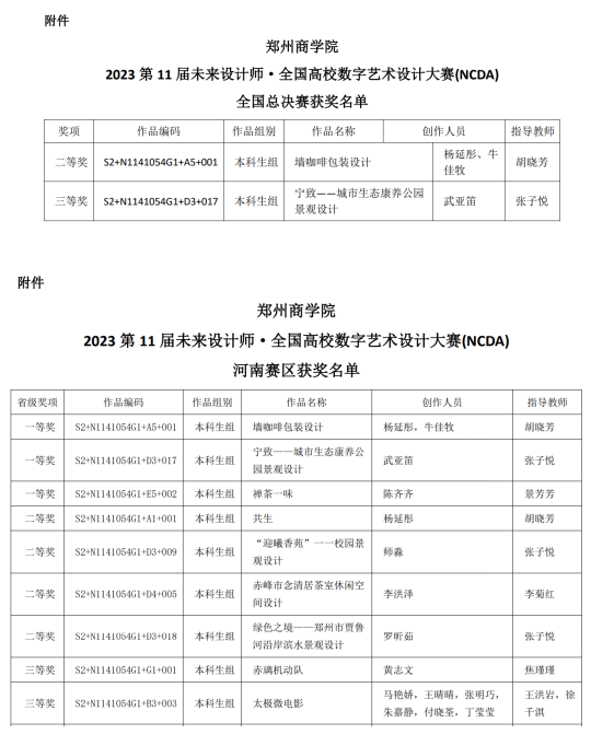 未来设计师·全国高校数字艺术设计大赛(NCDA)是由工信部人才交流中心主办,教育部中国高等教育学会认定,15个省教育厅发文立项,“学习强国”学习平台支持的国家级大学生竞赛。威尼斯官网艺术学院学生在第11届未来设计师·全国高校数字艺术设计大赛河南省赛中获一等奖3项,二等奖4项,三等奖9项。并且在全国总决赛中获得一等奖1项,三等奖1项。