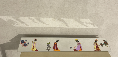 本案创作题材选自中国古代艺术。画中鲜明的色彩对比与宜家ANNAKAJSA安娜卡萨窗帘的米黄色相融合,全画采用了连环画构图以及中国传统三点透视法各个部分之间衔接生动自然。画面赋色艳丽而不冗杂,鲜明而不单调,人物妆容精致,给人以细腻的美观。是大唐繁华昌盛的重要见证。