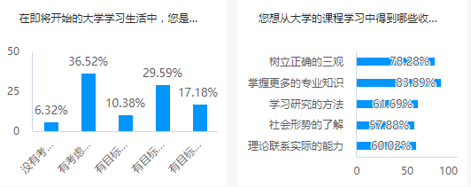 在大学中是否明确奋斗方向方面:有超过17.18%的学生有目标,并持续努力为这个目标奋斗;29.59%的学生有目标,但间断性奋斗,也就是想起时就努力,忘了就会稍微松懈;还有36.52%的学生仅仅只是有考虑,但并没有目标。由此可见学生们目标明确并能够持续努力的只有一小部分,还有很大一部分学生目标不是很明确,学生们想要从课程当中学到的树立正确的三观占到78.28%,掌握更多的专业知识占到83.89%,而学习研究的方法、社会形势的了解、理论联系实际的能力则基本持平,分别占到61.69%、57.88%、60.02%。