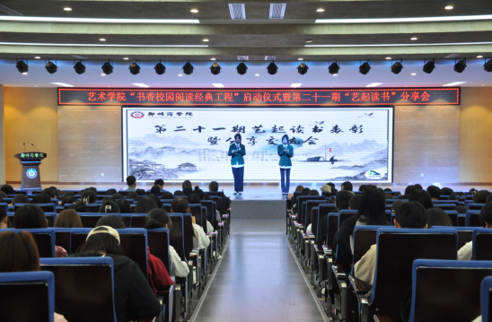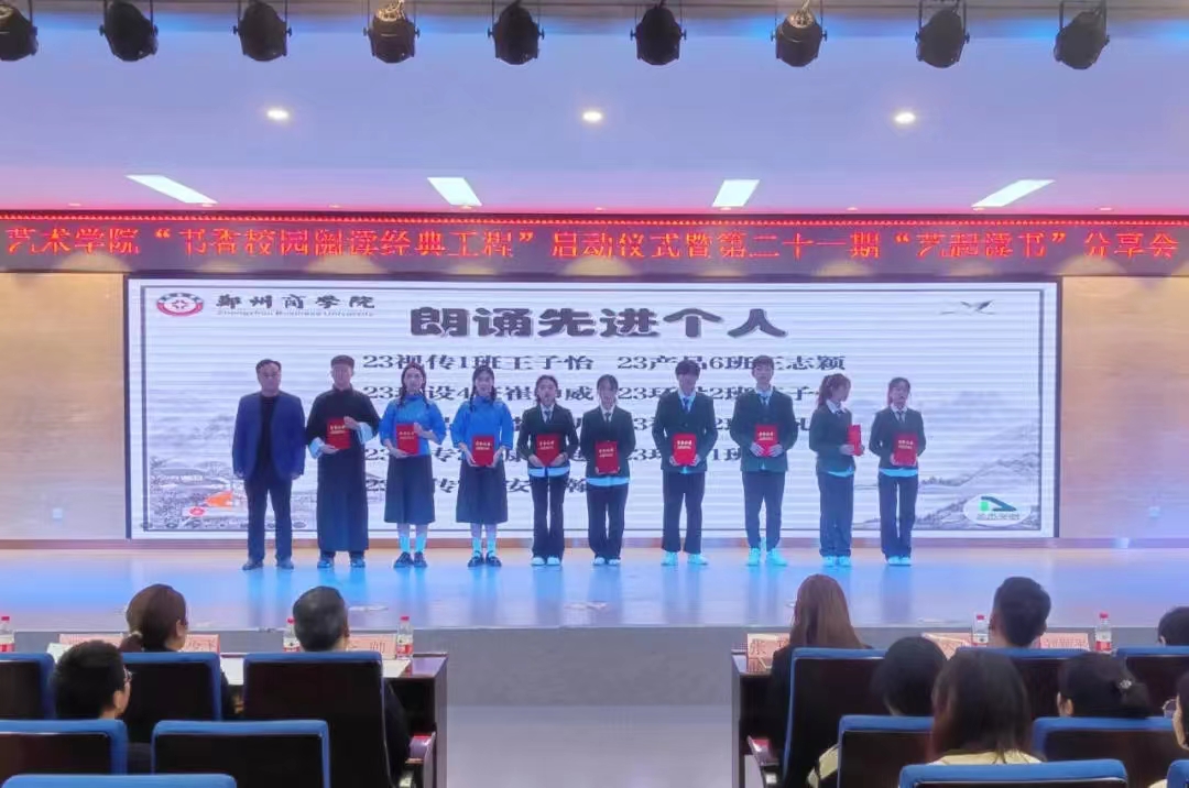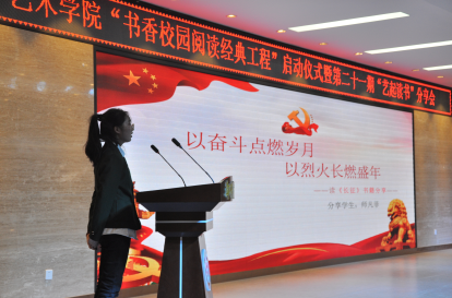 表彰结束后,由学生获奖代表依次上台分享他们的读书心得:《苦难辉煌》、《红星照耀中国》、《青春之歌》、《毛泽东选集》、《红船》、《长征》等著作,在同学们的解读中让大家传承红色基因,争做时代新人。而后,艺术学院辅导员范静怡老师分享书籍《诞生》,进一步鼓励学生展现青春担当。