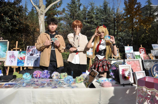 在学子风采展示环节,cosplay、漫画衍生品定制与售卖、现场书画展示吸引了大家视线。学生们通过将兴趣爱好到艺术成果的转化,从课程作品到商业品的转化,体验到了学习和创业的乐趣。