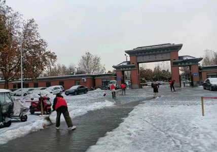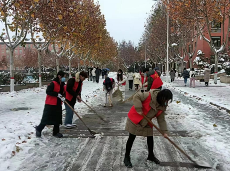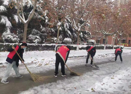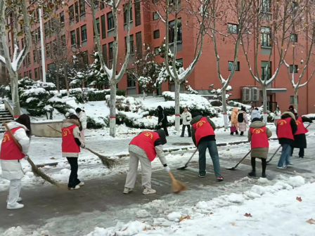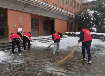 为了保障师生们的出行安全和校园内道路畅通,学生党支部的党员们拿到劳动工具后提前部署,分组协作,不畏严寒,闻雪而动,踏雪而行。经过一个小时的奋战,从艺术大楼通往学校大门、学生餐厅及学生宿舍道路上的积雪被清理得干干净净,大家团结协作,顶着寒风挥动着铁锹和扫帚,以最快的速度将积雪清理干净,为广大师生开辟了一条条洋溢着温情的方便之路,在银白的校园里亮出一抹“党员红”。