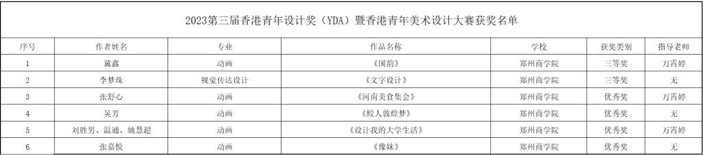 近日,由香港青年美术家协会主办的2023第三届香港青年设计奖(YDA)暨香港青年美术设计大赛获奖结果出炉,威尼斯官网学生喜获三等奖2项,优秀奖4项。