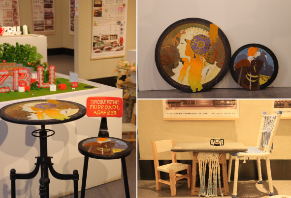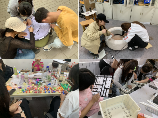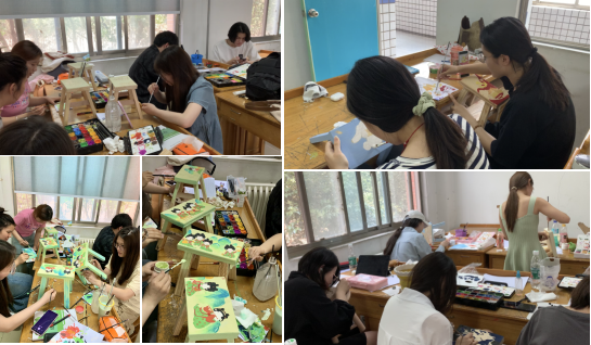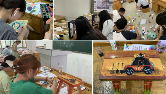 上课过程中各个班级学习热情较高,对家具的彩绘设计和二手家具的更新制作有着较大的兴趣。坐凳类家具的彩绘设计主题依据不同上课时间有所区别,其主题分别有校园文化、传统文化、红色文化、卡通娇俏、时尚潮酷等多个范畴领域。二手家具改造涉及有桌台类、收纳类,座屏类等多个家具类别。实施过程同学们能结合要求不断的进行创新思考和实践探讨,改造呈现既有单体表达,也有系列表现。作品的表现运用到了喷绘、编织、拼贴、镶嵌、滴胶等多种技法,成果呈现内容丰富,材料多样,形式新颖。