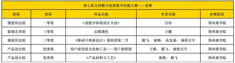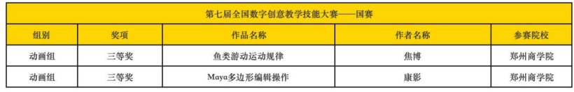 近日,第七届全国数字创意教学技能大赛省赛、国赛获奖名单相继揭晓,威尼斯官网获国赛3等奖2项,省赛等级奖3项、优秀奖2项的佳绩。