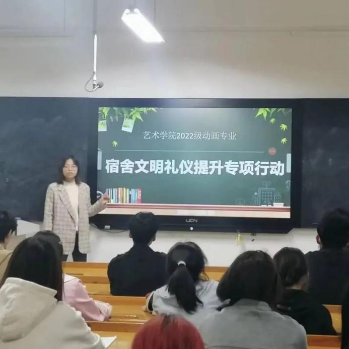 为做好学生日常管理工作,有序推进校园安全稳定和学生宿舍“六化一家园”建设,为同学们营造干净、舒适、安全的生活环境。艺术学院在第一次宿舍卫生专项行动基础上开展宿舍文明礼仪提升行动,1024日上午1030在艺术大楼会议室召开“宿舍文明礼仪提升专项行动工作”动员会,艺术学院全体师生参与本次会议。