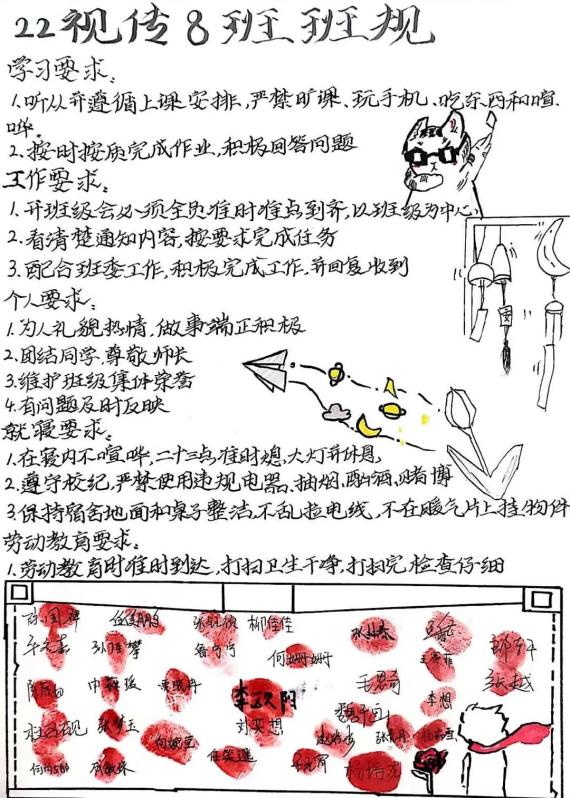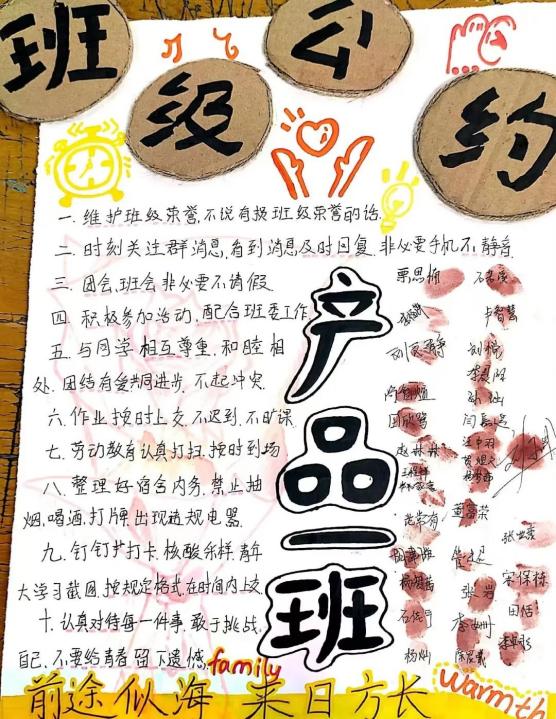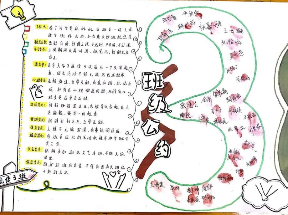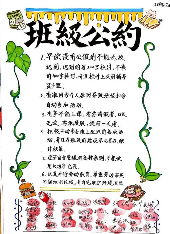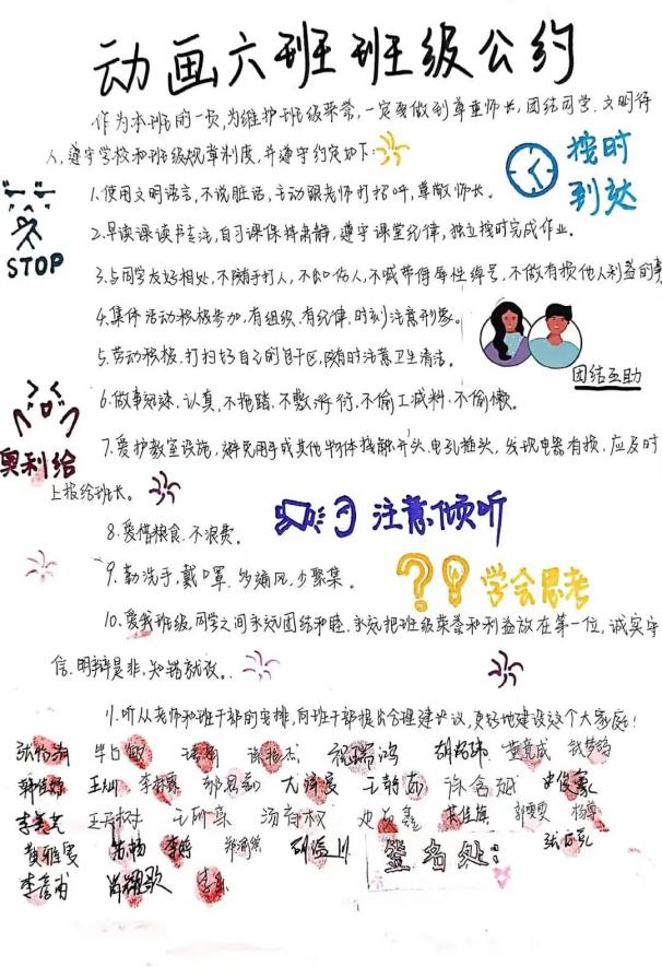 各班成员通过举手表决的形式提出意见统一收集,再以班级投票的方式最终确定公约内容。班级成员共同装饰班级公约后以签字、按手印等方式确保公约的公正性。最终在规定时间内将班级文明公约交至活动地点,拍照留存并交送至评审团完成此次活动。