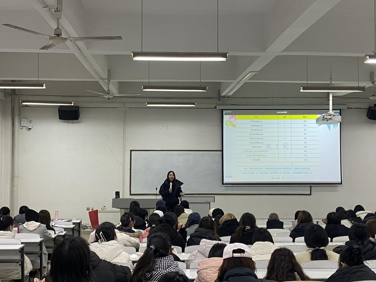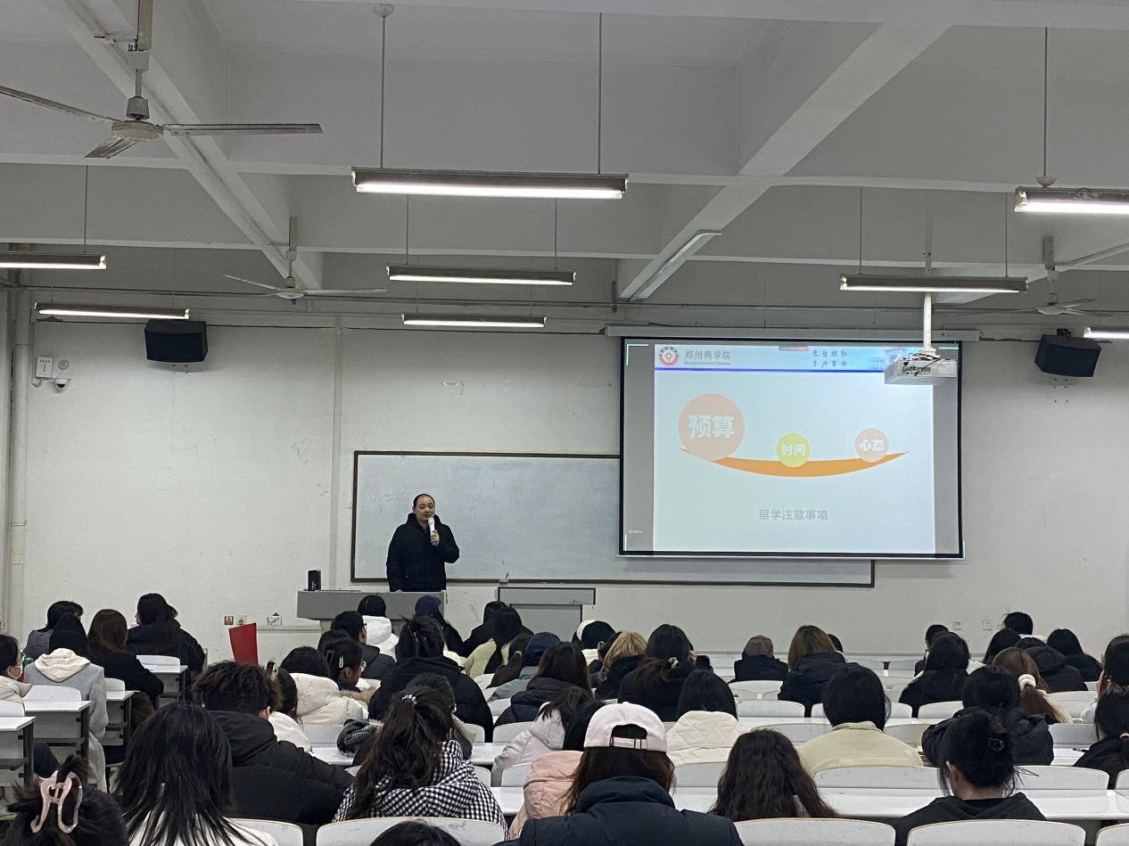 其次两位教师分别从申请准备、学习生活、文化交流等多个方面进行了详尽而深入的介绍。首先,侯佳老师以自身申报院校经验为学生进行了深入详细介绍,详细讲解了自己的择校历程、申请经过以及材料准备事项,侯老师特别强调了如何避免误区,如何减轻费用压力,通过分享自己在申请过程中遇到的种种挑战和应对策略,鼓励学生们保持积极的心态,勇于面对困难。焦博老师通过展示自己留学期间的照片,为学生分享了海外留学现状、生活成本规划、国外学习技巧等,让在场的师生们真切感受到海外生活的丰富多彩。