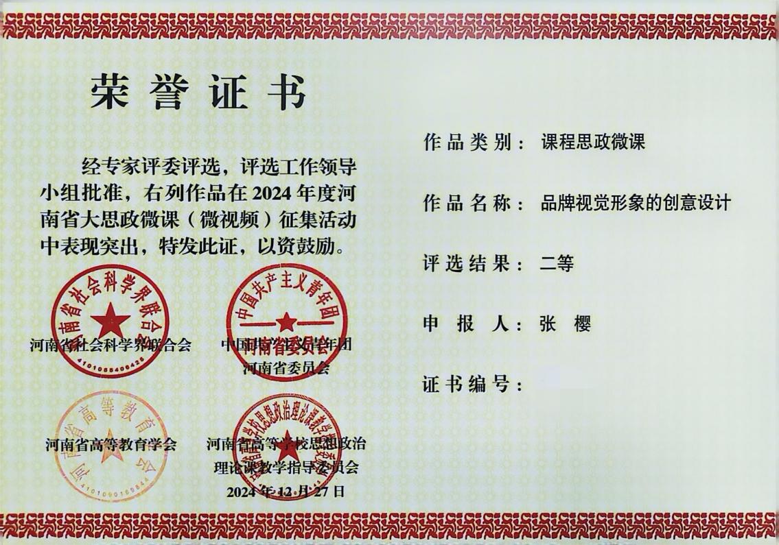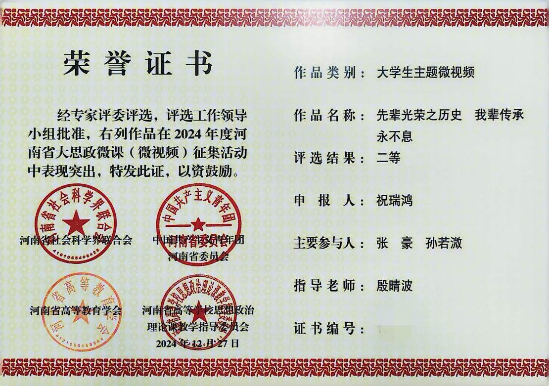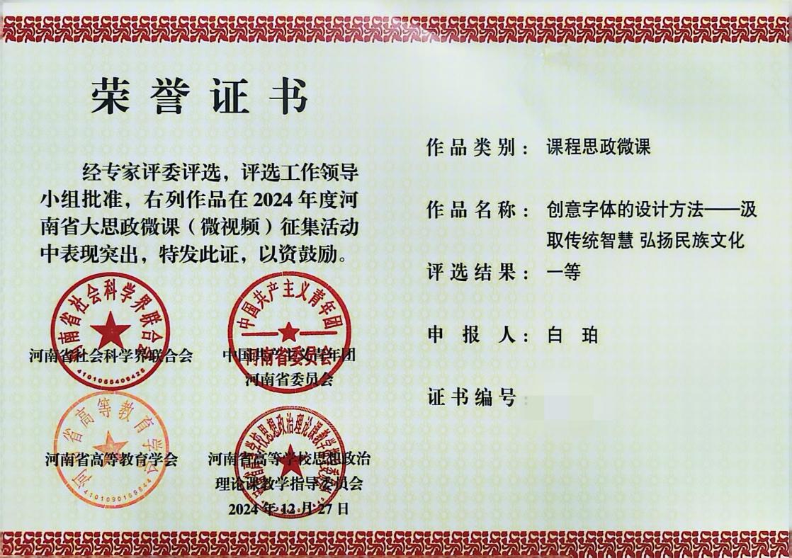 近日,河南省社会科学界联合会、中国共产主义青年团河南省委员会、河南省高等学校思想政治理论课教学指导委员会联合发布《关于公布2024年度河南省大思政微课(微视频)征集活动评选结果的通知》(豫社科联字〔2024〕19号)。艺术学院在此次活动中共斩获4个奖项,其中思政微视频1项、课程思政微课2项、大学生主题微视频1项,其中一等奖2项、二等奖2项。