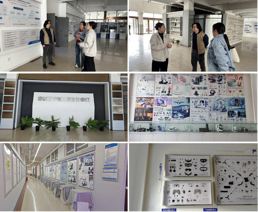 教师团队重点参观了工业设计中心展厅和校企合作共建工作室,中原工学院工业设计中心主任付晓莉教授介绍了中心与翔宇医疗、威猛等知名企业共同开发的一系列创新设计项目及近些年工作室建设上的成果。付教授的研究生向教师团队介绍了工作室同学们获得的奖项及优秀毕业设计作品。