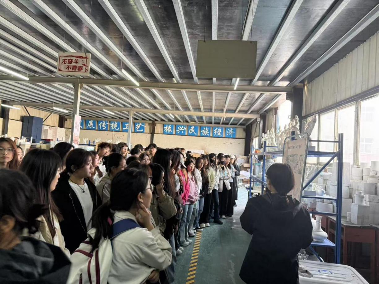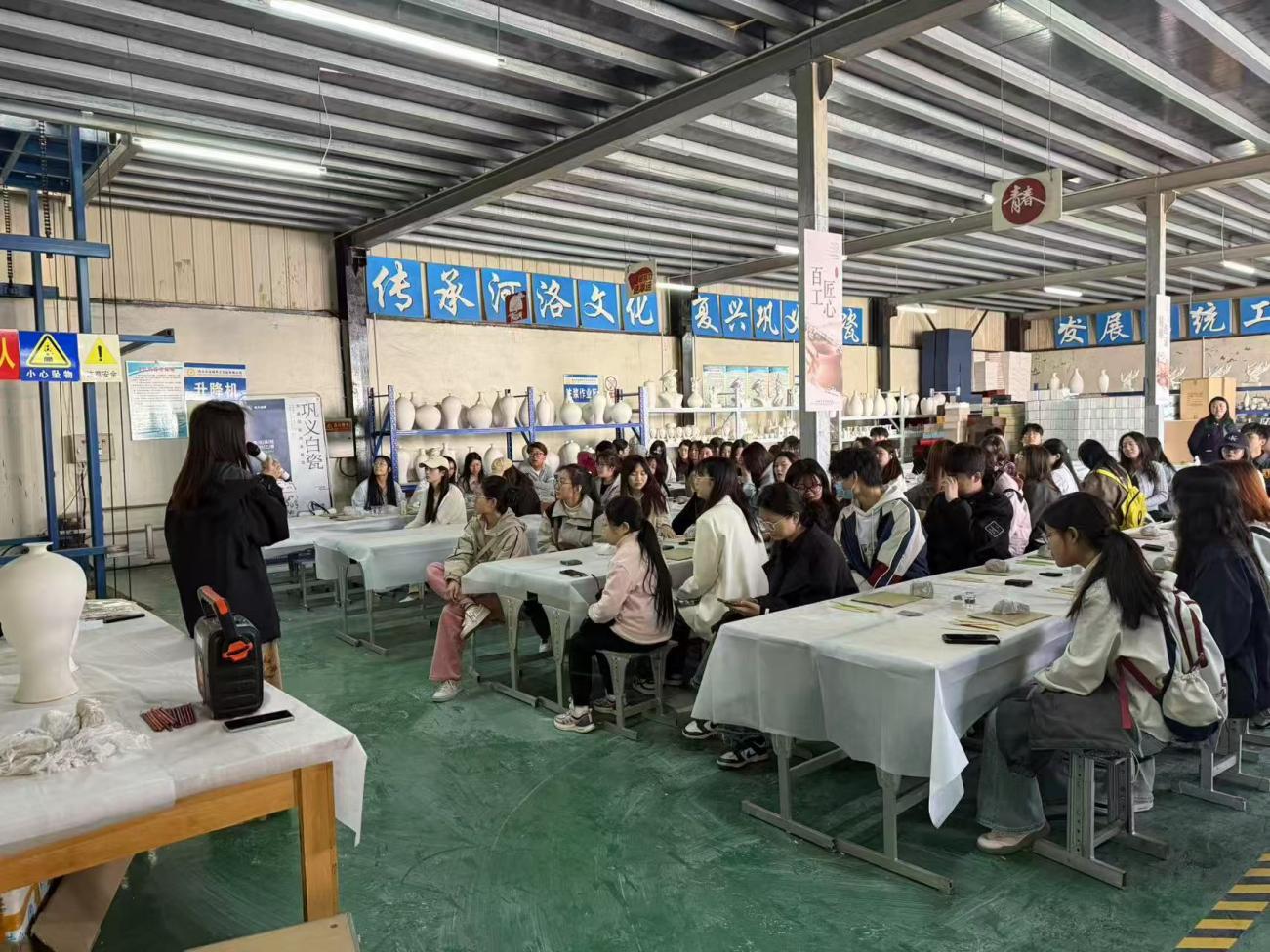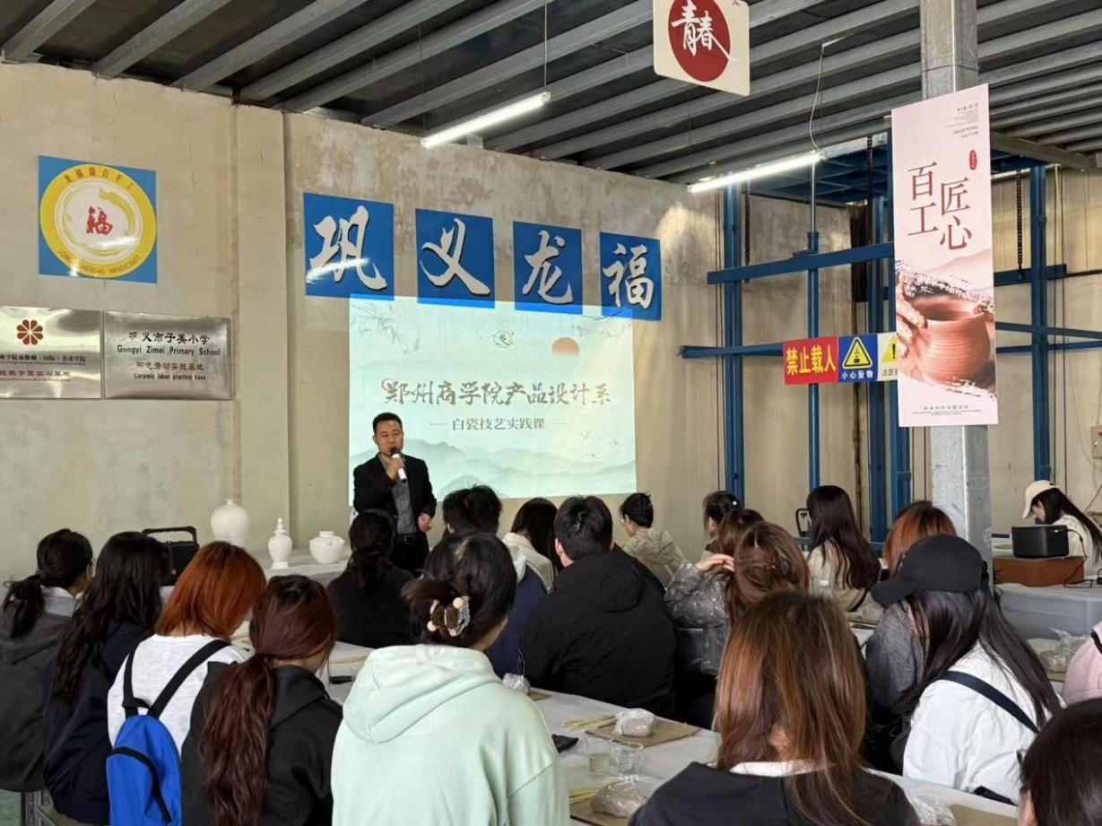 次日,学生走进巩义龙福白瓷工厂开展实践。活动伊始,总经理韩总致辞阐释巩义白瓷“白如凝脂、声如磬玉”的艺术价值。学生们依次参观原料车间、拉坯成型区、施釉工坊及高温窑炉,近距离观察瓷泥经修坯、施釉、1320℃淬炼成器的全过程。随后,通过纪录片与教师讲解,学生深入理解巩县窑历史及白瓷文化内涵。