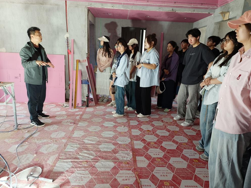 在施工工地实训方面,环设专业的指导教师带领学生深入巩义市施工场地,观摩“放线-水电预埋-吊顶龙骨-墙面批荡-主材安装”的流水作业,详细讲解施工过程中遇到的各种问题,学生亲手操作激光水平仪放线,亲身感受到“现场是最好的设计课堂”。