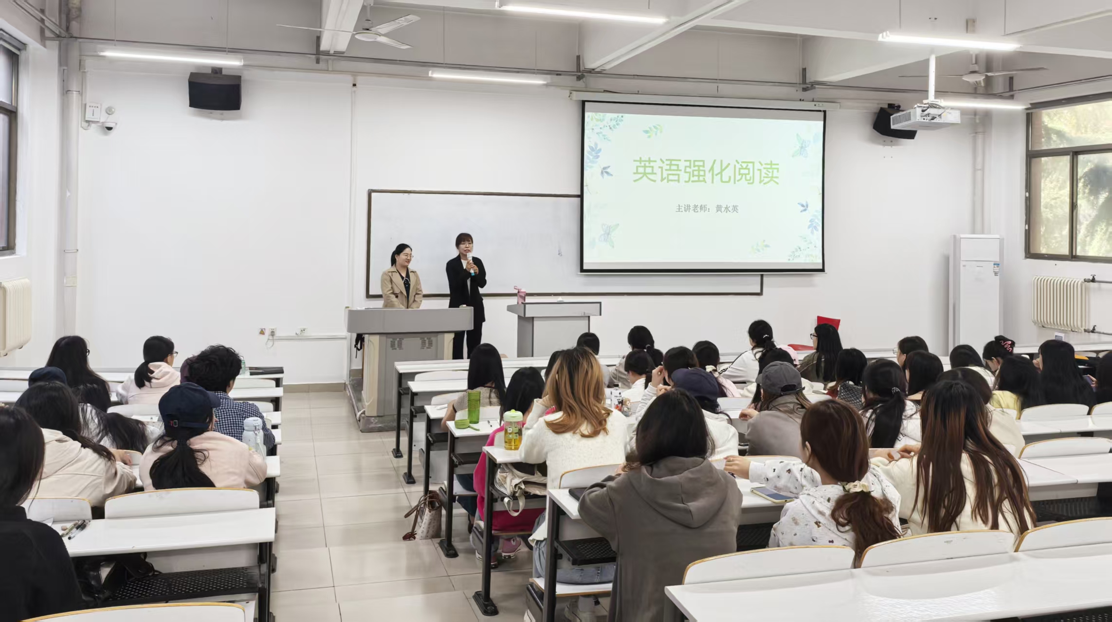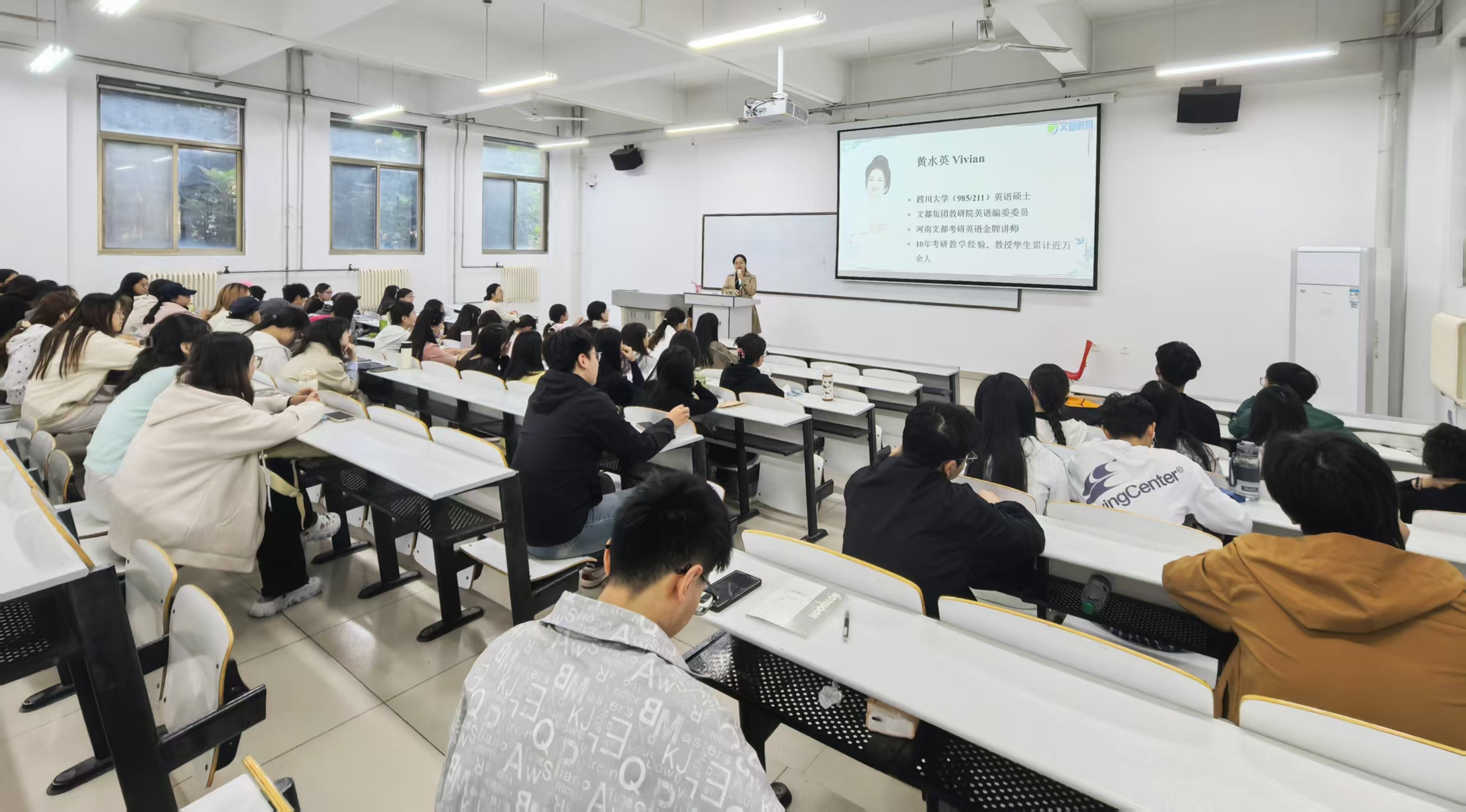 随后,文都考研英语资深讲师黄水英老师登上授课,黄老师凭借其丰富的教学经验和深厚的学术功底,为同学们带来了一场精彩纷呈的英语盛宴。她重点讲解了阅读理解部分,强调分析阅读的重要性,通过例题展示如何快速捕捉文章主旨和关键信息,并指出阅读理解需深入挖掘文字背后的逻辑关系。为帮助学生高效解题,黄老师还分享了合理分配答题时间、先易后难等实用策略,并强调了词汇积累和语法学习的基础作用,鼓励同学们日常学习中注重积累,提升英语综合能力。