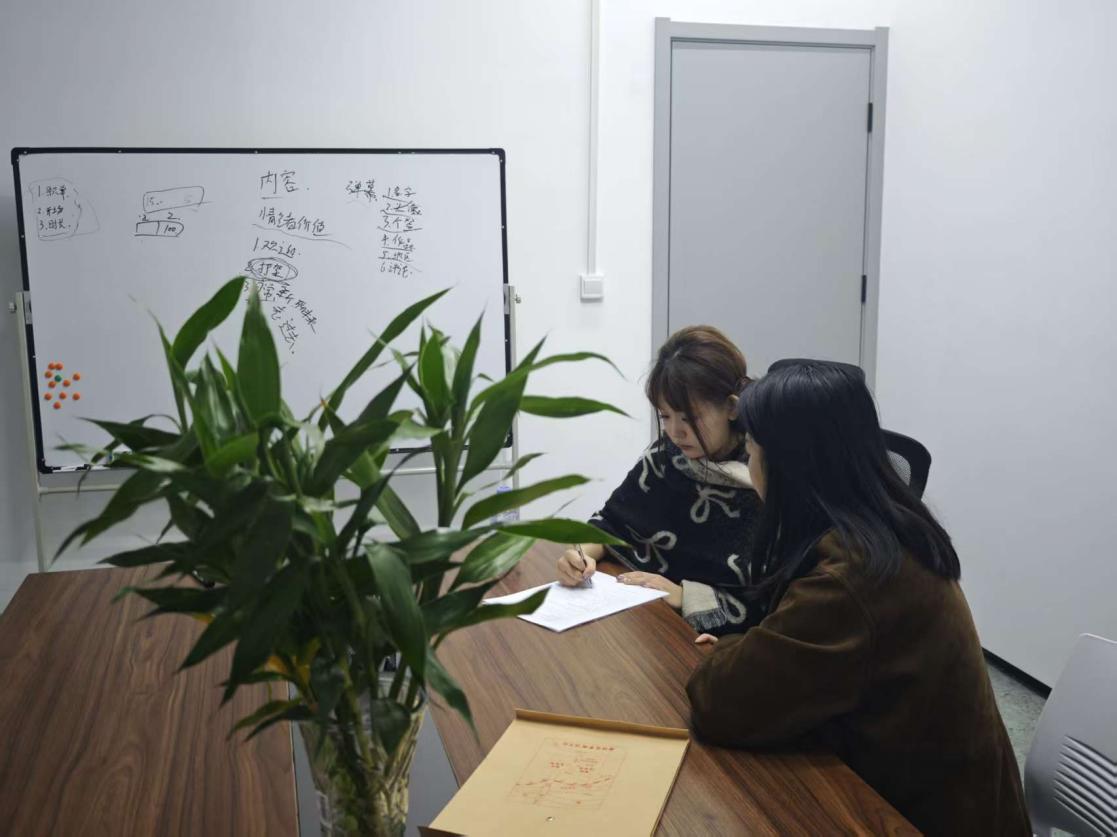 随后,两位老师抵达2022级环境设计专业许婉钰同学的自主创业公司——河南天婉传媒有限公司。在企业运营部门,老师们现场观摩了学生参与的短视频策划、视觉设计等工作环节,与企业人力资源负责人围绕传媒行业人才需求标准、实习实训方案优化等议题深入交流。企业方表示,学院实习生在内容创作中展现出的艺术审美与创意表现力,为团队注入了新鲜活力。唐老师与实习生们围坐畅谈,倾听大家从“校园创作”到“商业产出”的角色转变心得,针对创意落地、职场沟通等问题提供指导,鼓励同学们在传媒实践中找准专业定位,积累实战经验。